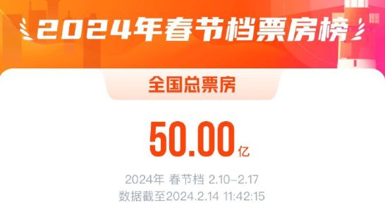 據(jù)燈塔專(zhuān)業(yè)版數(shù)據(jù),截至2月14日11時(shí)42分,2024年春節(jié)檔(2月10日—2月17日)檔期總票房(含預(yù)售)突破50億!《熱辣滾燙》《飛馳人生2》《熊出沒(méi)·逆轉(zhuǎn)時(shí)空》暫列檔期票房前三位。至此,2024年春節(jié)檔觀影人次突破一億人,春節(jié)檔已連續(xù)6年觀影人次破億。賈玲執(zhí)導(dǎo)并主演的《熱辣滾燙》以17.185