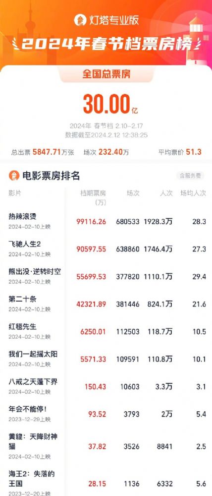 龍年春節(jié),中國電影市場紅紅火火。據(jù)燈塔專業(yè)版數(shù)據(jù)顯示,截至2月12日12時38分,2024年春節(jié)檔(2月10日—2月17日)檔期總票房(含預(yù)售)已突破30億元?!稛崂睗L燙》《飛馳人生2》《熊出沒·逆轉(zhuǎn)時空》暫列檔期票房前三位。